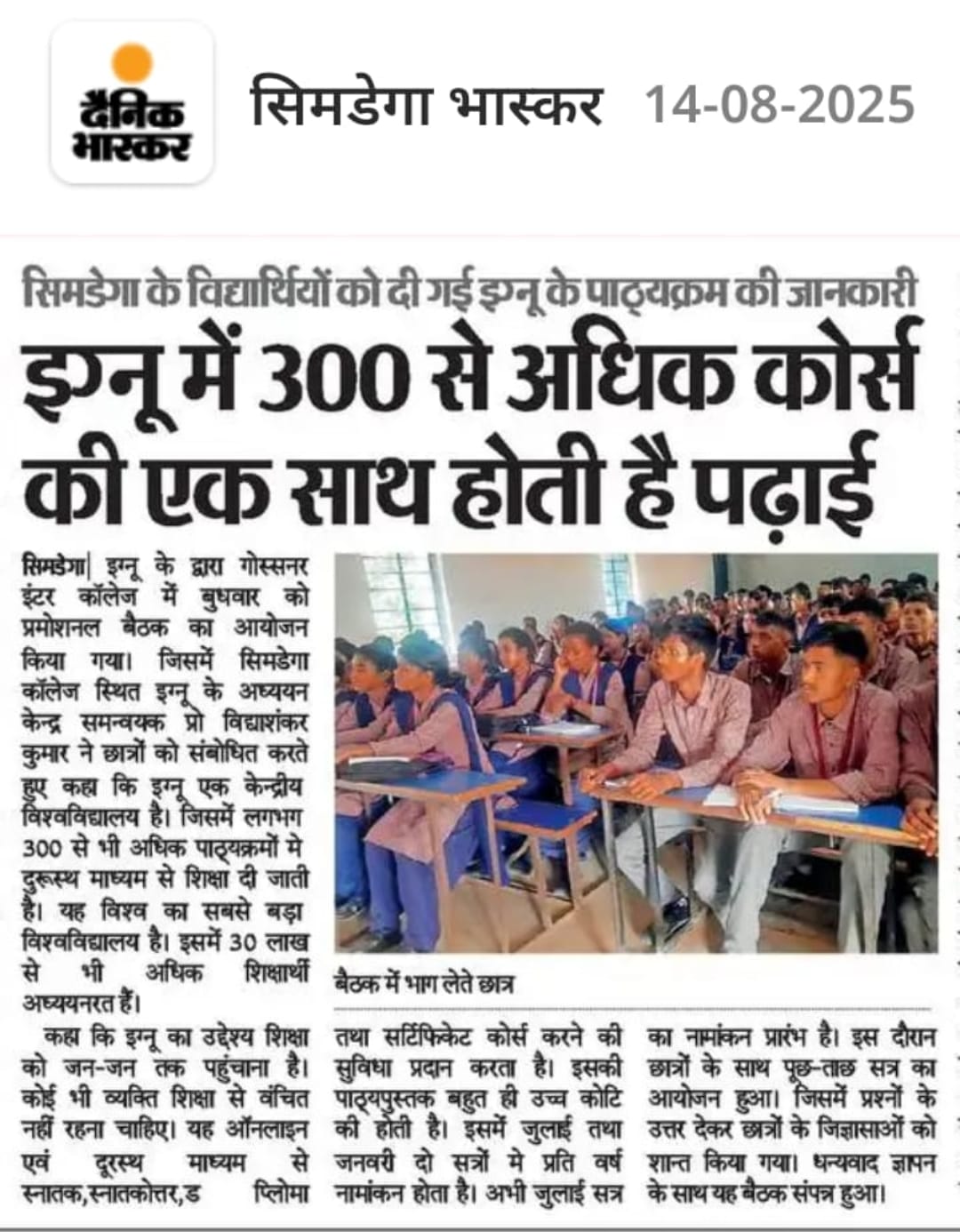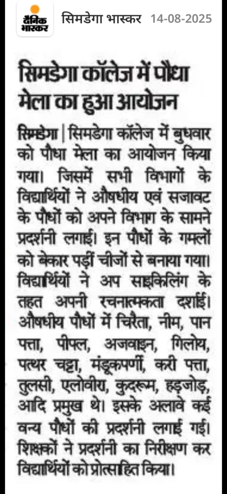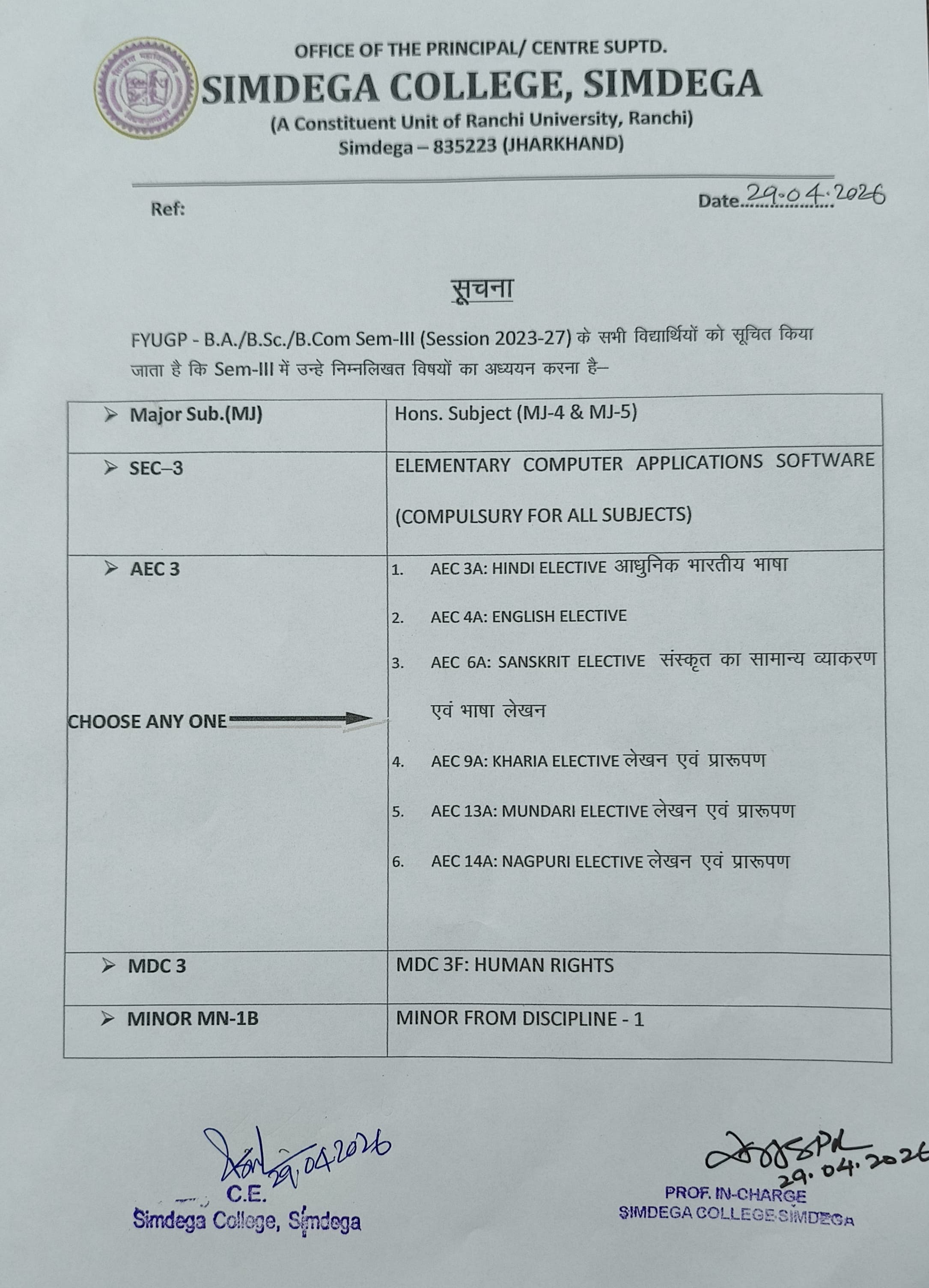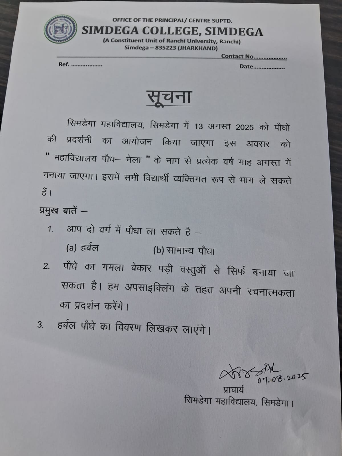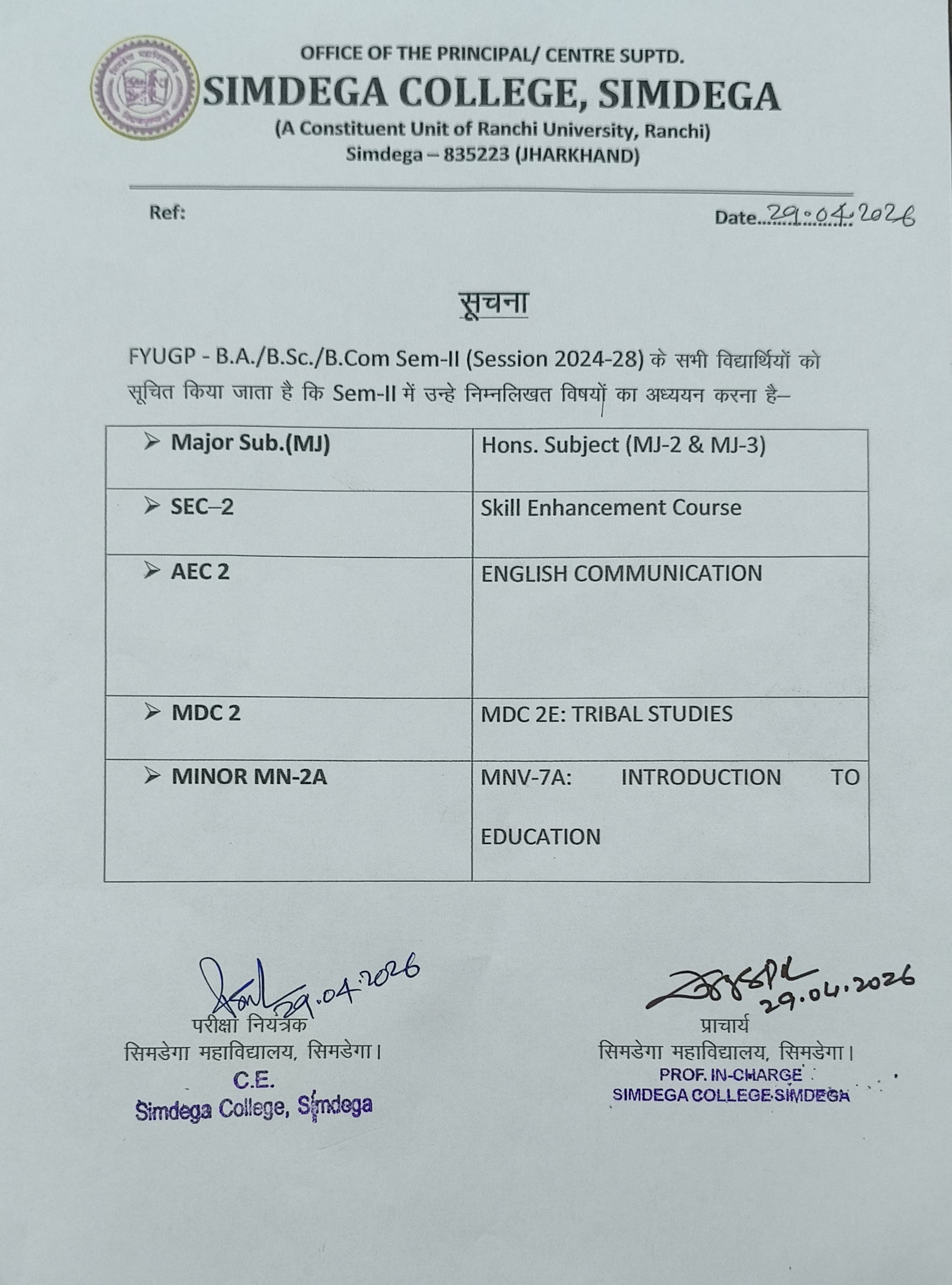 Simdega College, Simdega established in 1960, is one of the oldest institutions under Ranchi University. It was founded with the generous contribution of Sri Jagdish Prasad, a social thinker and Philomath from Tukupani, who donated the land on which the college building now stands. Situated in one of the remotest areas, the college serves the educational needs of a large population, extending to the borders of the states of Odisha and Chhattisgarh.