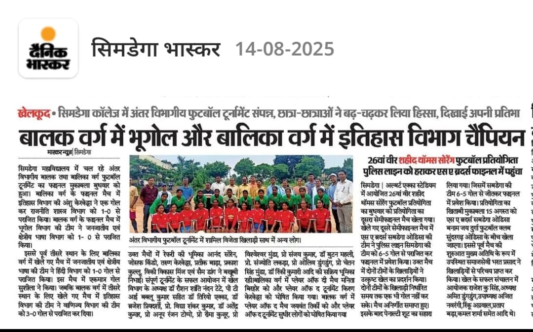 प्रत्येक छात्र के सर्वांगीण विकास हेतु उनपर व्यक्तिगत रूप से ध्यान देकर उनकी वास्तविक क्षमतानुसार शिक्षा के साथ - साथ खेल एवं विभिन्न सामाजिक कार्यों में बेहतर प्रदर्शन हेतु महाविद्यालय परिवार उन्हें प्रेरित करता है। परिणामस्वरूप वर्ष 2025 की भारतीय महिला हॉकी टीम में सिमडेगा महाविद्यालय की तीन छात्रायें - सलीमा टेटे, महिमा टेटे एवं संगीता कुमारी सम्मिलित है। मुझे यह उल्लेख करते हुए गर्व हो रहा है कि वर्तमान में भारतीय महिला हॉकी टीम की कप्तान सलीमा टेटे महाविद्यालय की छात्रा है और अर्जुन पुरस्कार से सम्मानित है। सलीमा टेटे को सिमडेगा जिले की प्रथम महिला ओलम्पियन होने का भी गौरव प्राप्त है। इसके अलावे वर्तमान में सिमडेगा कॉलेज में अध्ययनरत कई खिलाडी राष्ट्रीय स्तर की प्रतियोगिता में झारखण्ड टीम का प्रतिनिधित्व करते हुए राज्य के लिए पदक विजेता बनी है। हॉकी के अतिरिक्त सिमडेगा कॉलेज की सरस्वती कुमारी एवं अंशु लकड़ा झारखण्ड कुश्ती टीम का प्रतिनिधित्व कर रही है।